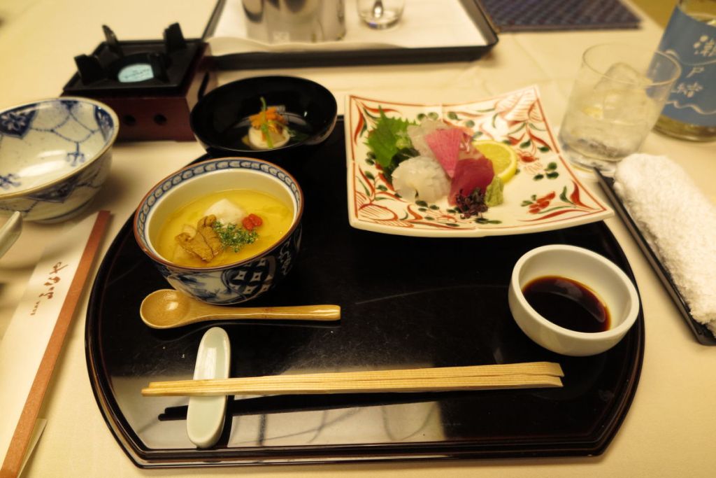 お椀、造り(タイ、カツオ、モンゴイカ)と鱧つみれの玉地蒸し。特に玉地蒸しは今まで食べたことのない美味でした。