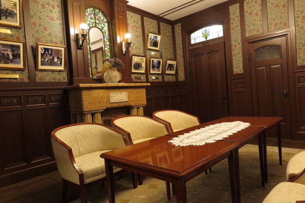 松山空港へのタクシーを待っている間に、館内にある展示室を見ました。写真は1950年に昭和天皇が宿泊された洋室を移築したもので、その当時の洋館の資材は英国から取り寄せて作られたそうです。皇族方が愛媛に来る際は今でもふなやを利用されているようです。