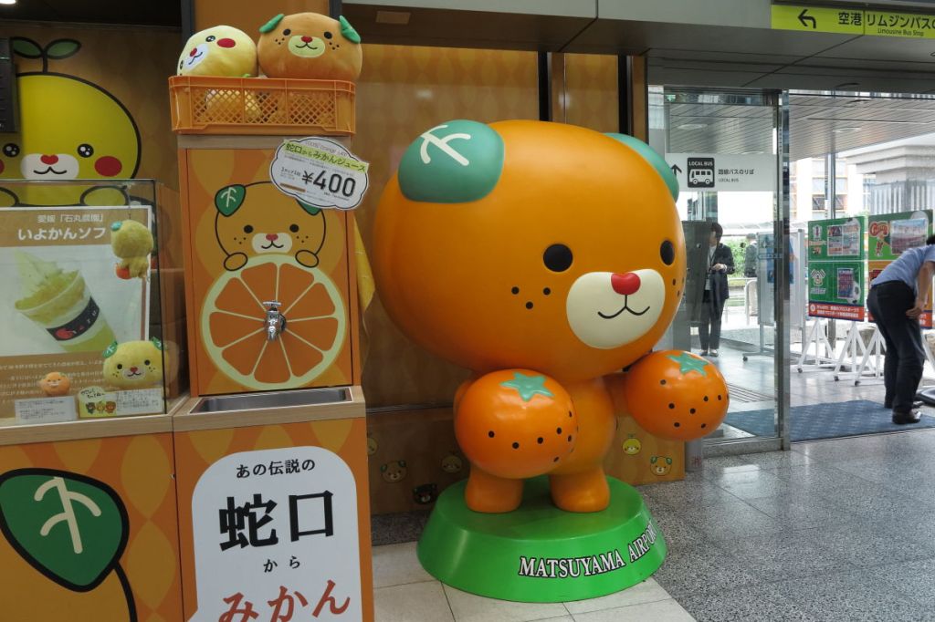 松山空港は道後温泉から30分程度の便利な位置にあります。入口を入ると蛇口からミカンジュースがあり、愛媛らしさを感じました。