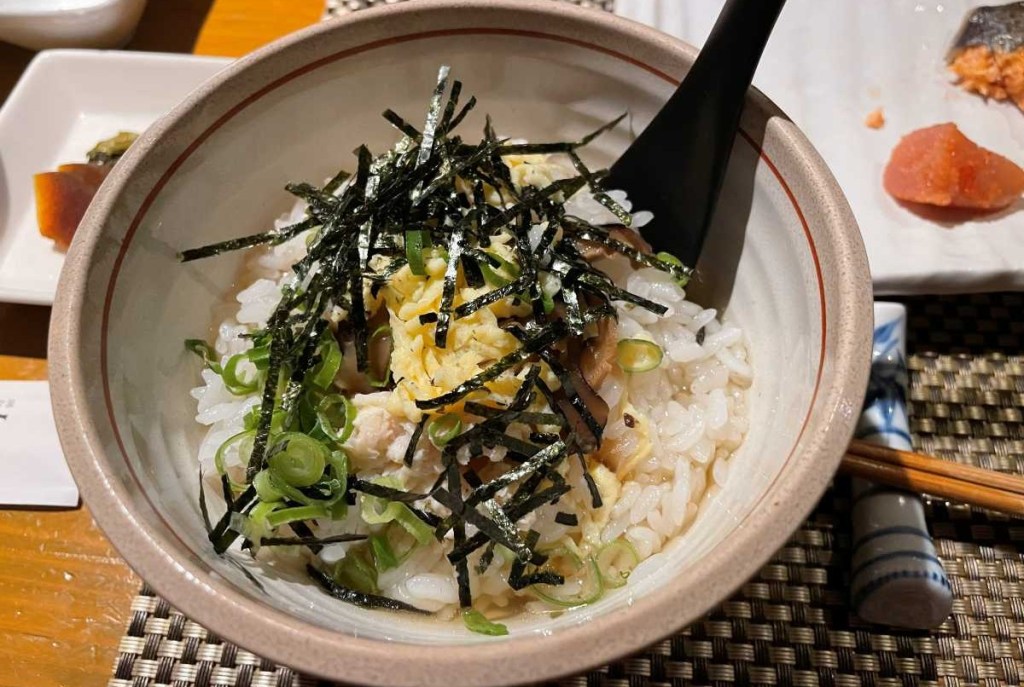 朝風呂にゆっくり浸かった後に朝食会場に行きました。シンプルな和定食ですが、左上の薬味をご飯にのせ、鶏ガラの出し汁をかけると鶏飯になります。鶏飯は奄美大島の郷土料理ですが、鶏ガラの出し汁と具材が融合し深みのある味わいになります。