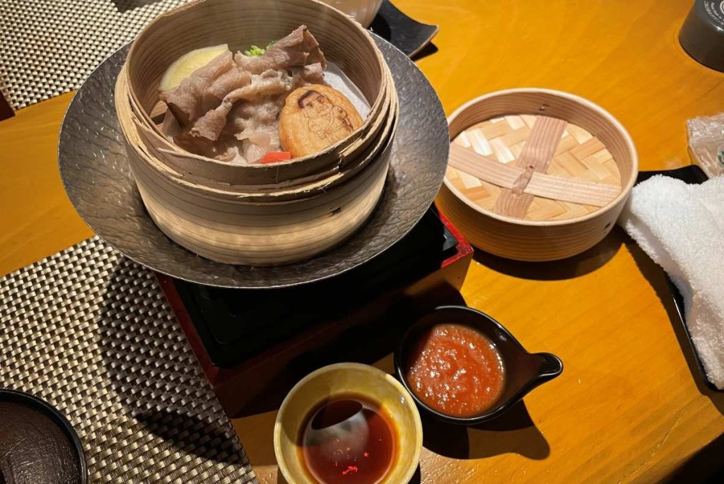 蒸し料理も付いていましたが、西郷どんの絵が描いてある薩摩揚げがとてもユーモラスで可愛いです。トマトソースとポン酢で美味しくいただきました。