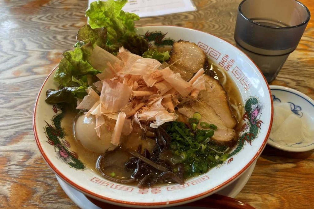 昼食は空港のそばにある地元の人気店まことラーメンに行きました。ここは2024年の鹿児島ラーメングランプリで準優勝した店で駐車場は地元ナンバーの車が多く駐車していました。待つこと1時間強ようやく店内に入り、お勧めのUMAMIラーメンに味玉と野菜をトッピングしたものを注文しました。特にこれといった特徴のあるラーメンではなく、可もなく不可もない味でした。これだけ待っても食べたい味とは思えませんでした。