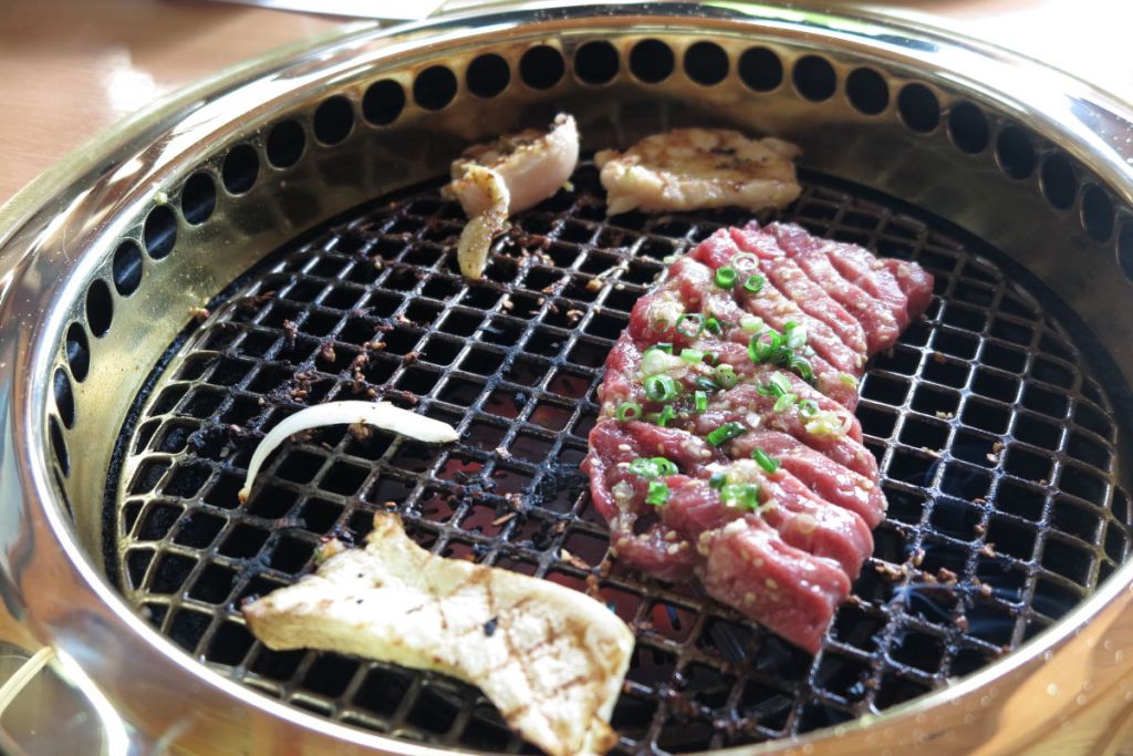 牛肉や鶏肉を使ったいろいろな焼肉定食などもあるのですが、前に食べて美味しかった、地元どり焼き定食を注文しました。とり刺しとサラダが付いていて、とり肉は胸ともも肉がありとてもジューシーでした。生でも食べられるそうなので新鮮さは抜群です。一品料理で牛タンも注文しましたが、大きな塊で焼いてからハサミで切りながら頂きました。