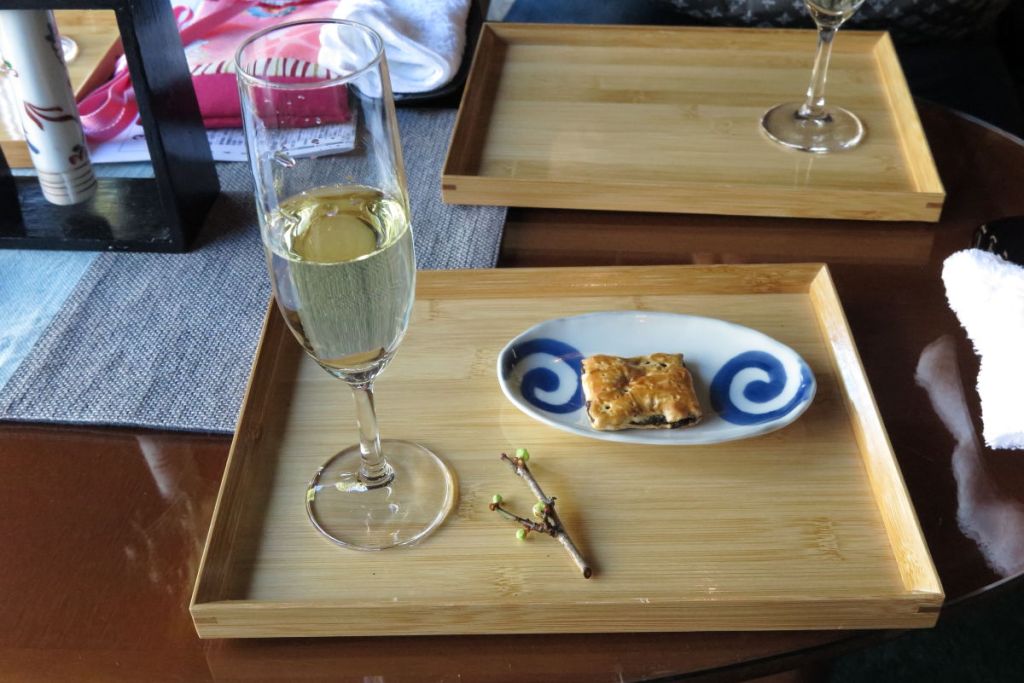 次に本日の宿である、いぶすき秀水園に向かいました。今回で3度目の宿泊ですが、2026年プロが選ぶ日本の旅館・ホテル100選で総合13位、料理部門では2位に入っている旅館です。料理部門では常に上位にランクされる料理自慢の宿です。宿でチェックインするとウェルカムドリンクがあり、スパークリングワインを頼みました。酒飲みにはうれしいもてなしです。