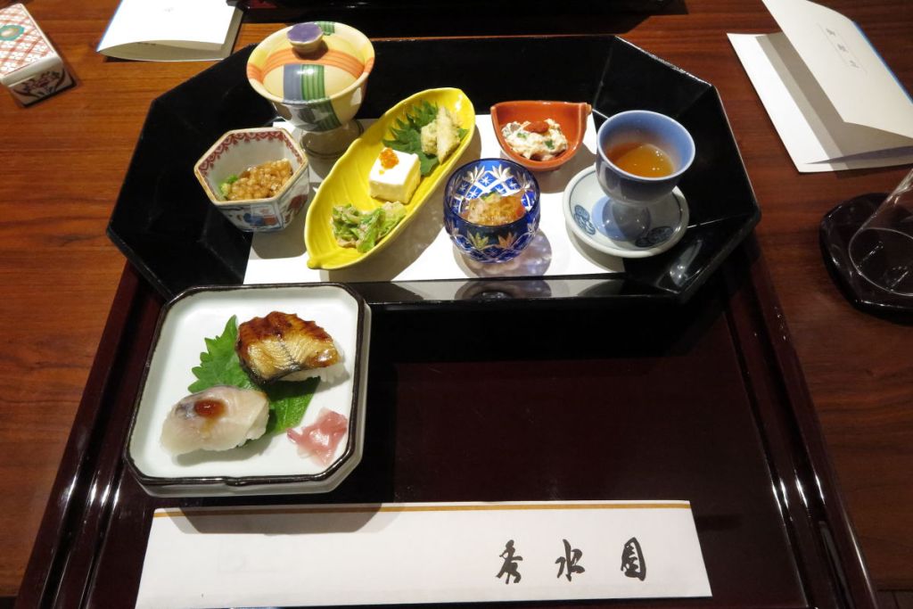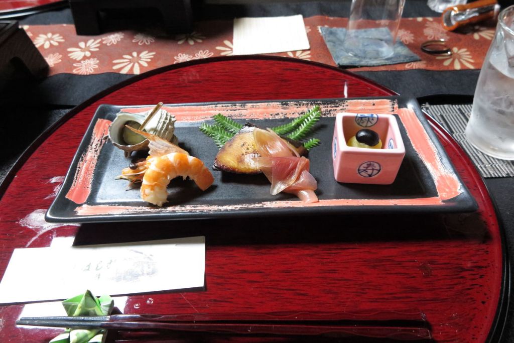 入浴後は部屋での夕食です。ダイニングテーブルでの部屋食なので足の筋力が低下している身には助かります。前菜は蟹三彩、竹の子木の芽和え、ワカサギ紫蘇揚げ、柿白和えなどです。JTBのプランで予約したので下にある指宿産の熟成生うなぎと焼きうなぎの握りが特別についていました。うなぎの血には毒があるので生で食べるのは初めてでしたが、フグのような食感でとても美味でした。