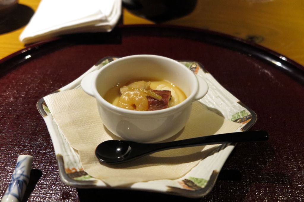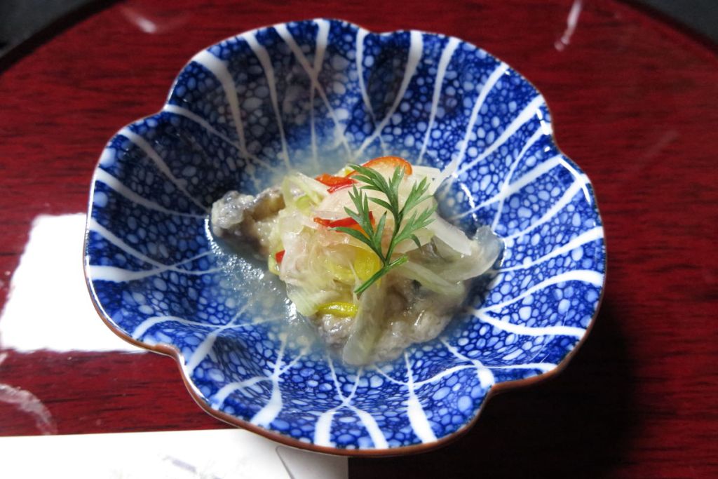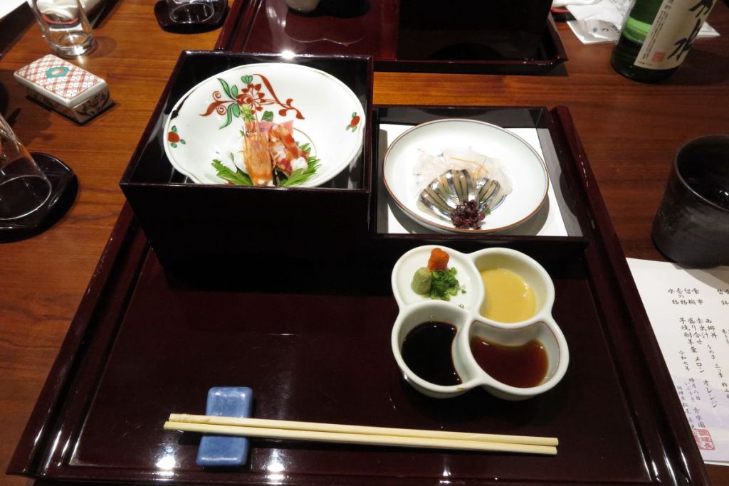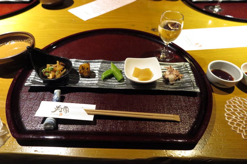 先付は、キャビアがのった赤海老帆立湯葉洋風和え、五色なますといくら醤油漬け・帆立貝・空豆です。サービスに焼酎の前割が一杯ついていました。安田という焼酎は手に入れるのは難しいそうです。ライチのようなフルーティーな香りを感じる焼酎でした。