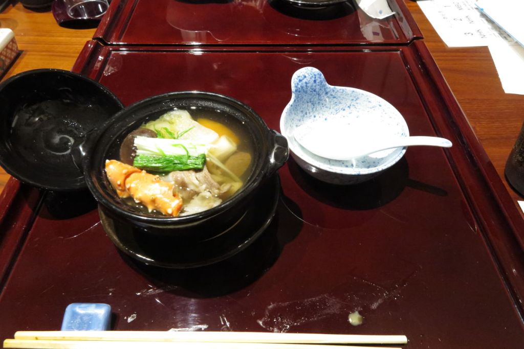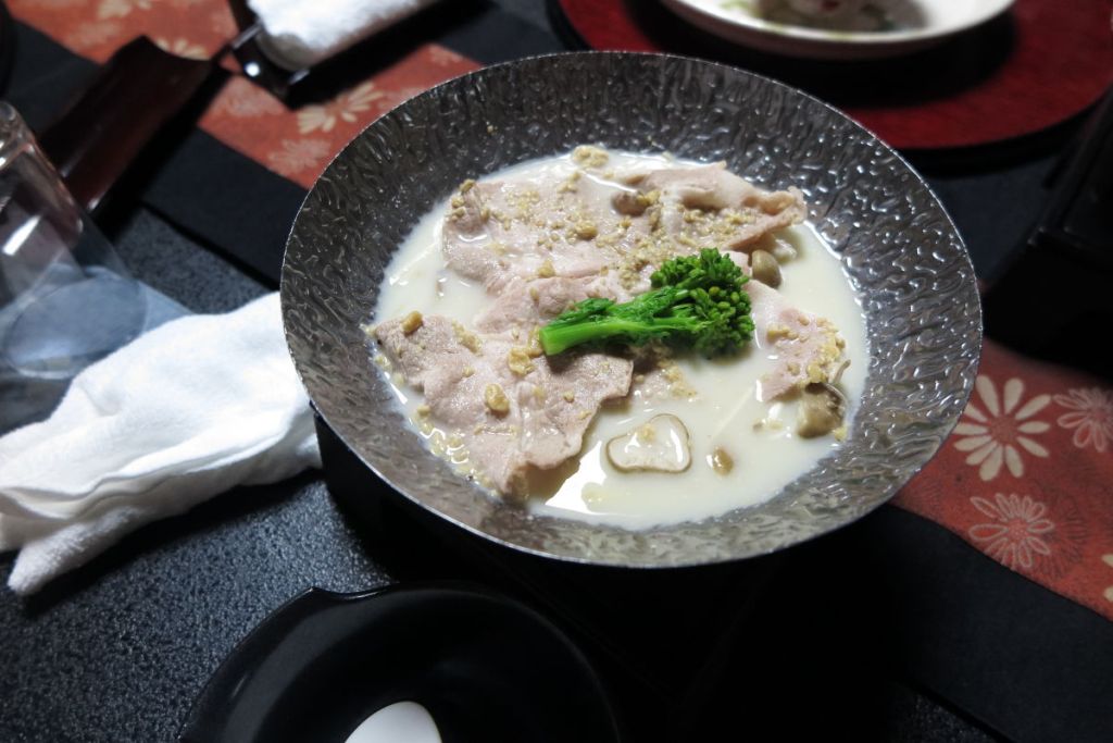 飛魚出汁の寄せ鍋には黒豚、鶏つみれ、湯葉やタラバガニなどたくさんの具材が楽しめました。