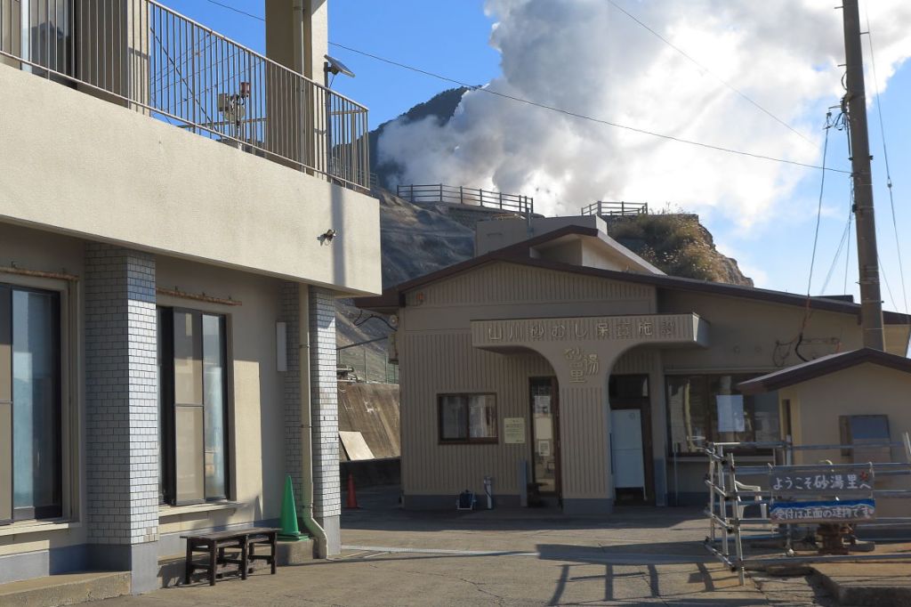 この秀水園から歩いて5分ぐらいのところに砂むし会館砂楽という砂むしの施設がありますが、以前行ったことがあるので、今回は少し離れた山川砂むし温泉砂湯里という砂むしの施設に行くことにしました。施設の後ろからすごい量の湯けむりが上がっています。
