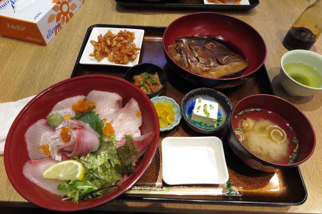 カンパチ海鮮丼にはカマのあら煮とヒメアマエビのかき揚げがついています。新鮮なカンパチの歯ごたえが心地よくとても美味でした。