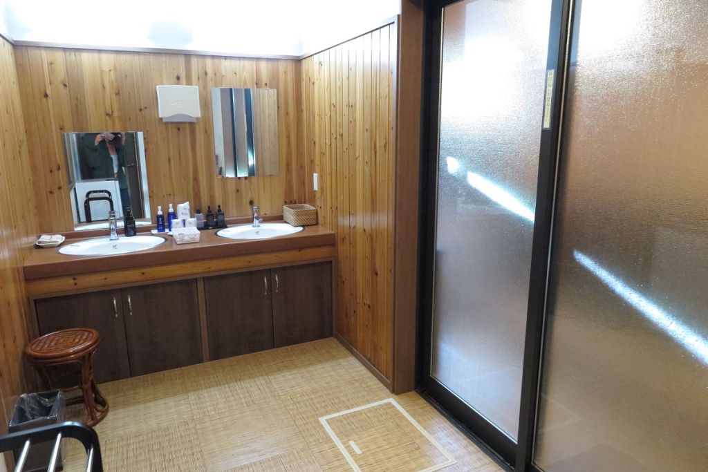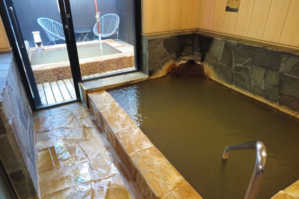 昼食を終え、本日の宿である妙見温泉にあるおりはし旅館に向かいました。おりはし旅館は1879年創業の老舗の旅館で日本秘湯を守る会にも入っています。天泉という離れの客室は、洋室と和室の2部屋でベッドもあり助かりました。驚いたのは部屋にある内風呂と露天風呂です。小規模な旅館の風呂と同じくらいあります。写真では見えませんが、露天風呂の横には湧き水の水湯のあります。