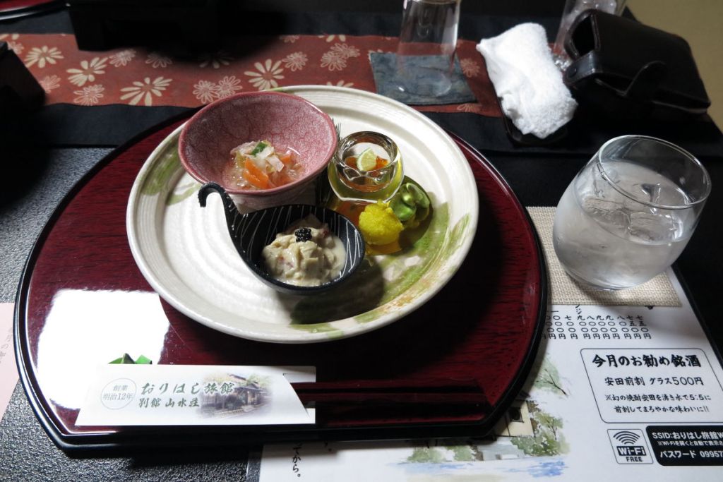 入浴後は1階にある食事処での夕食です。前菜は数の子、砂肝チャンジャ、蕪となまり節の辛子マヨ和え、スナップエンドウとスイートポテトです。