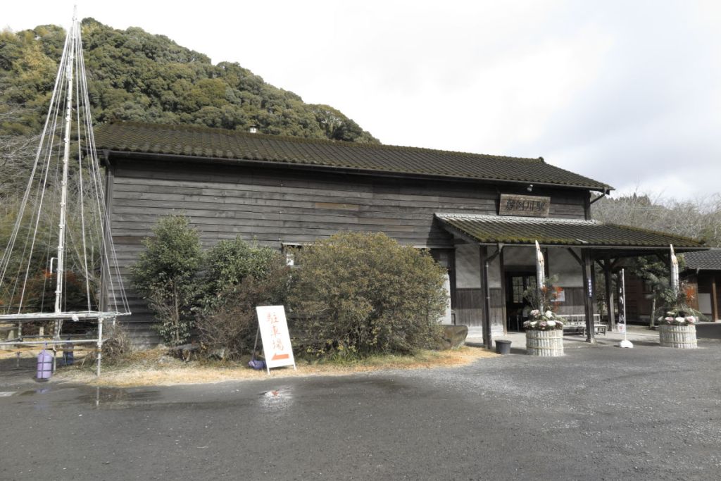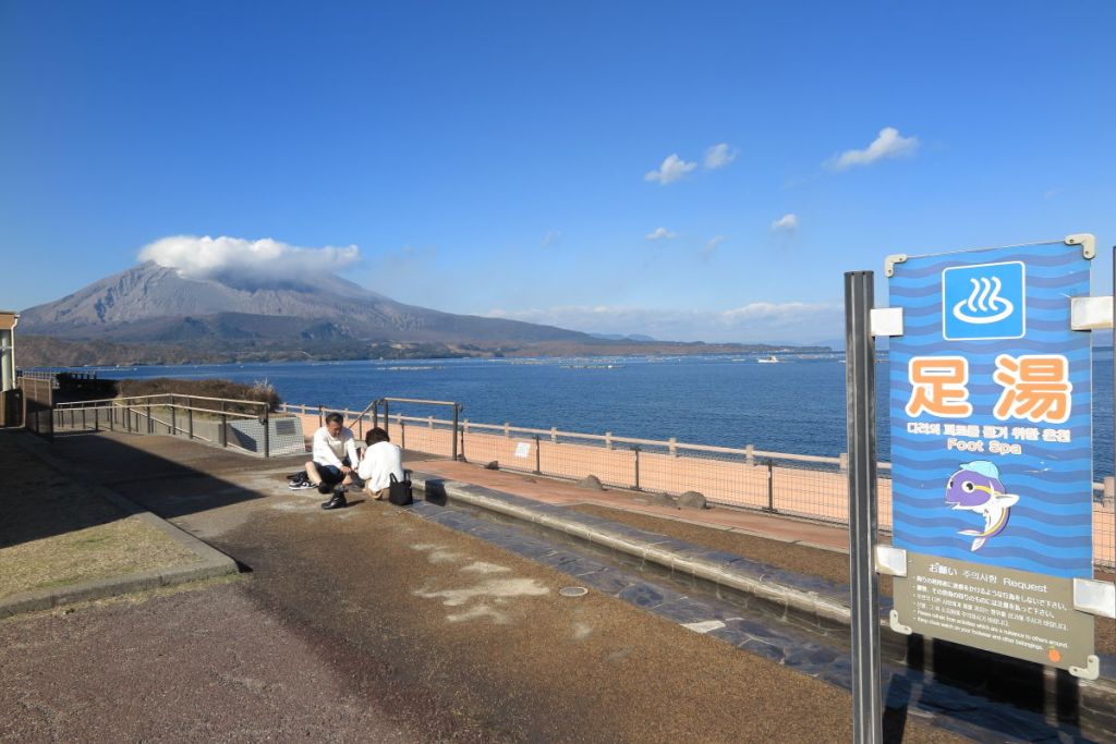 チェックアウト後は大隅半島をドライブします。まずは以前にも立ち寄った桜島にほど近い、道の駅たるみずで休憩しました。ここでは足湯に浸かりながら桜島を見ることができます。この近辺の錦江湾には養殖いかだが多数あり、水揚げされたばかりの新鮮な魚を味わうことができます。