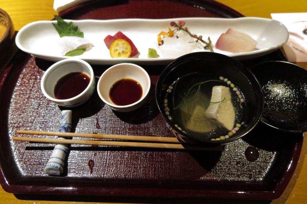 刺身は、左から馬面ハギ、本鮪、紋甲イカ、かんぱちで、吸物は鰤と大根などのです。