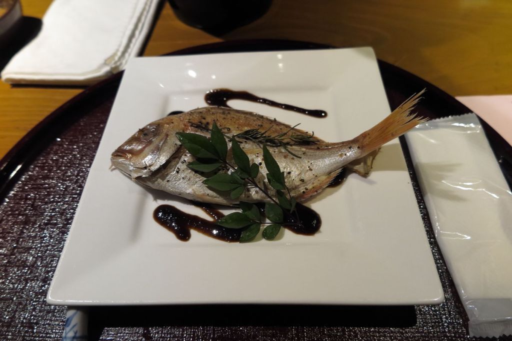 小鯛はオーブン焼きのローズマリー風味でバルサミコ昆布ソースで食べるととても美味です。