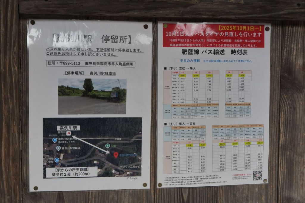 列車が来る気配がないのでよく見ると大雨の影響で2025年10月から吉松駅と隼人駅間で運休しており代替のバス輸送をしているとのことでした。早く復旧されることを祈っています。