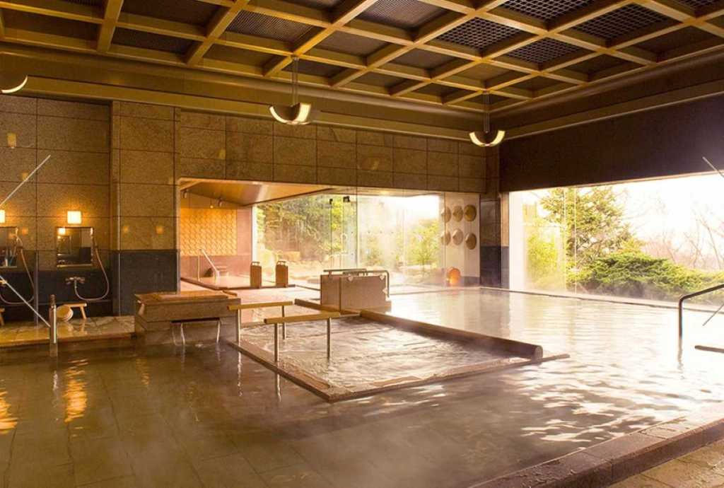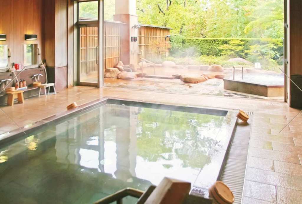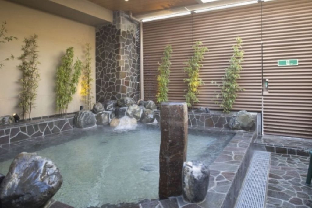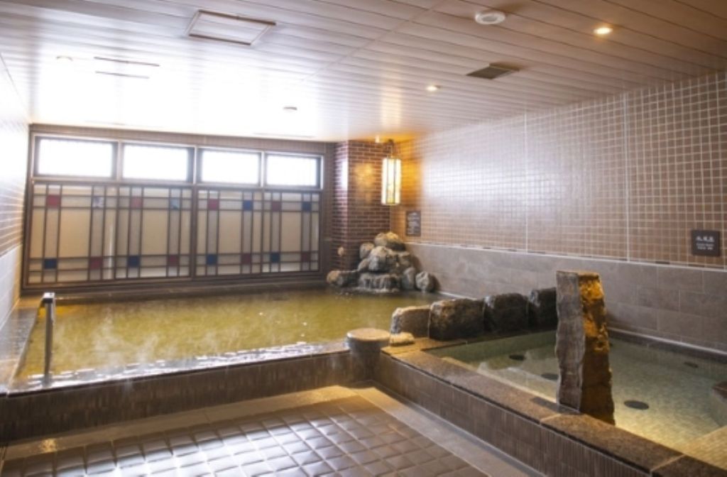 ホテルの看板に書いてあるようにここには浪漫湯という温泉浴場があり、内風呂と露天風呂があり温泉気分を味わえます。温泉は近くにある朝日温泉からの運び湯で弱アルカリ性の単純温泉です。写真はホテルのHPのスクリーンショットです。
