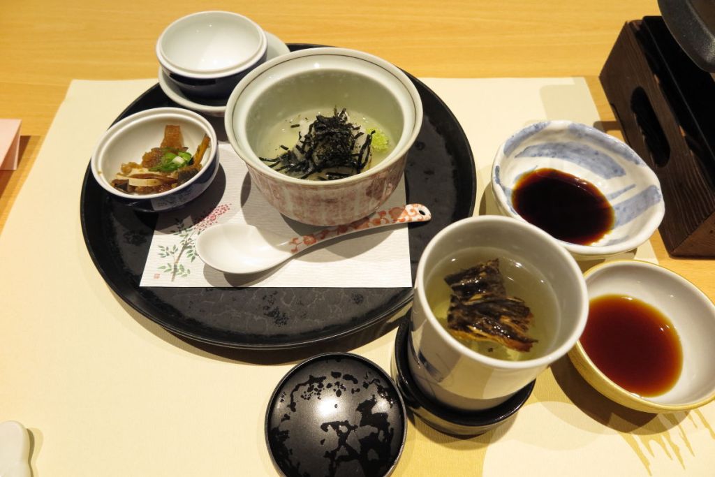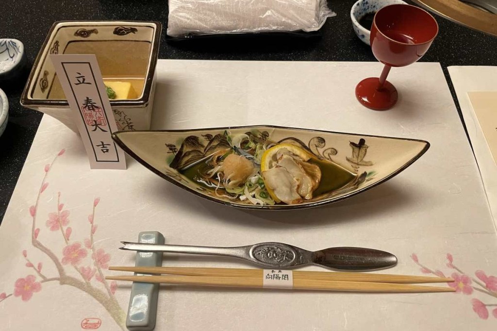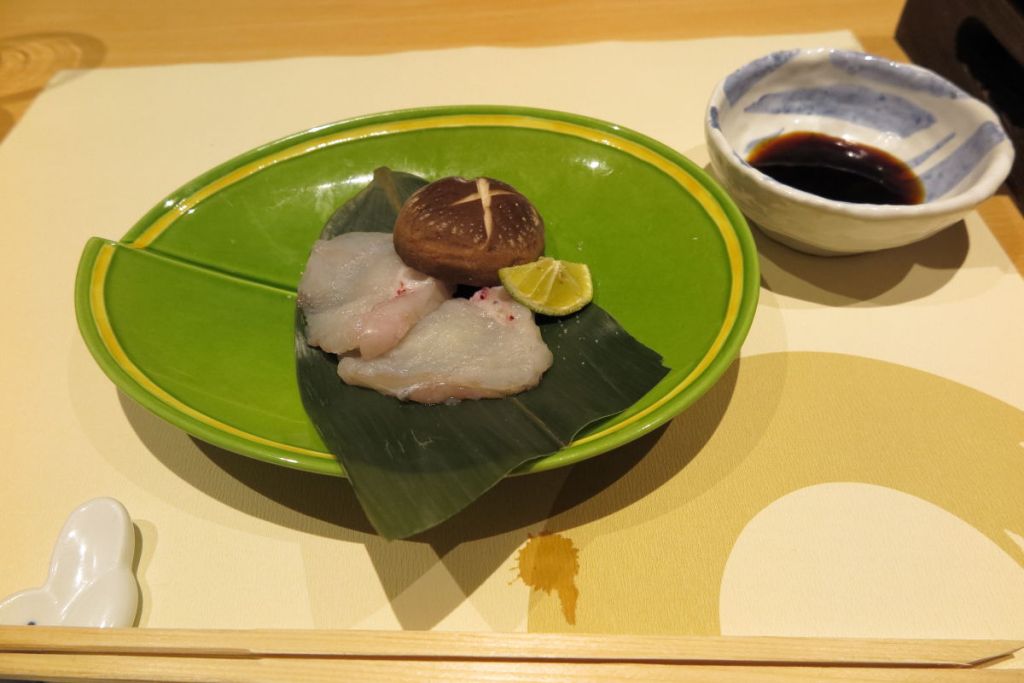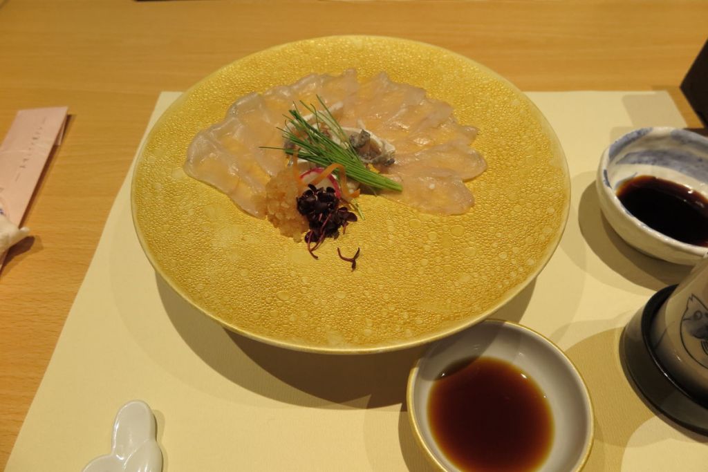 夕食は炭火焼旬会席のプランにしました。突き出しはフグの皮の酢の物でした。