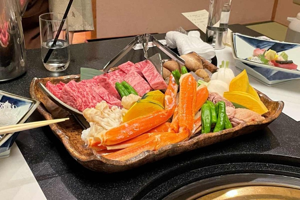 炭火焼きは六甲和牛、ズワイガニ、名古屋コーチンと野菜各種