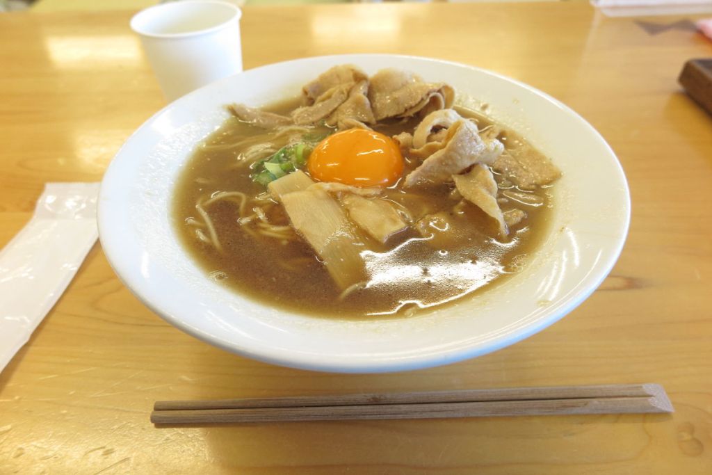 徳島ラーメンは茶色、白、黄色系のスープが特徴ですが、ここのラーメンは主流の茶色系で豚骨スープに濃い口醤油を入れた濃厚な味わいのスープです。生卵をトッピングしているのが特徴的で、ご飯を一緒に食べる人も多くいます。