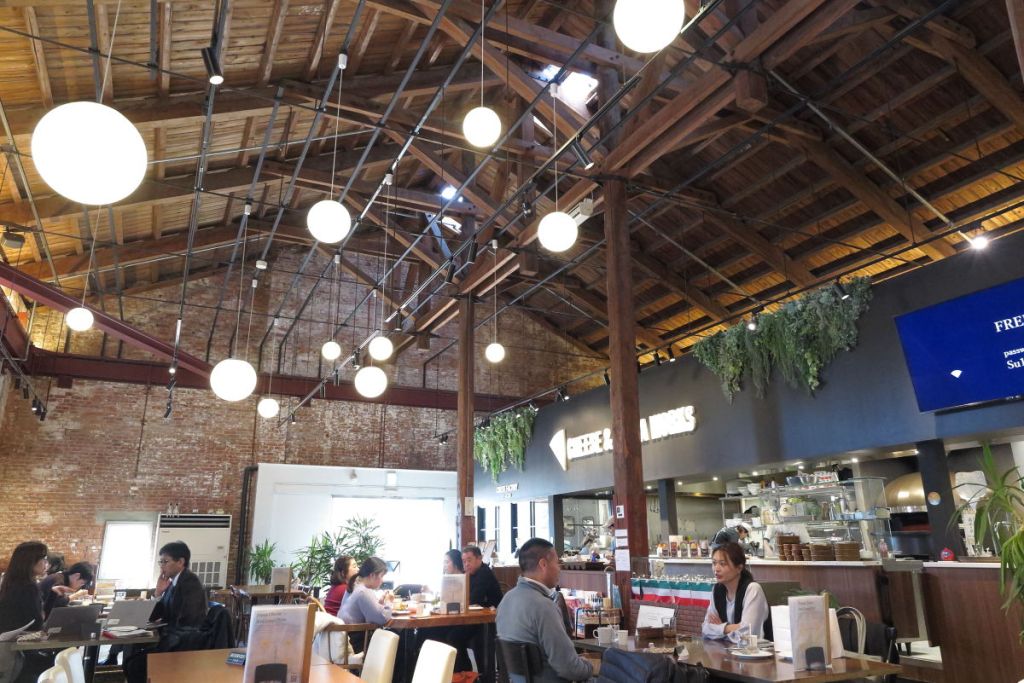 絶景を楽しんだあとに淡路島の洲本市にある旧鐘紡洲本工場の赤レンガ建物群に向かいました。昼食時なのでこの一角に2021年にオープンしたS Brickという施設でピザを食べました。店内は広々としてお洒落な感じです。