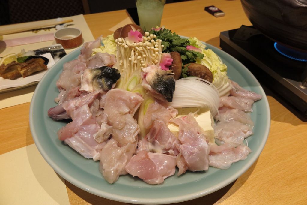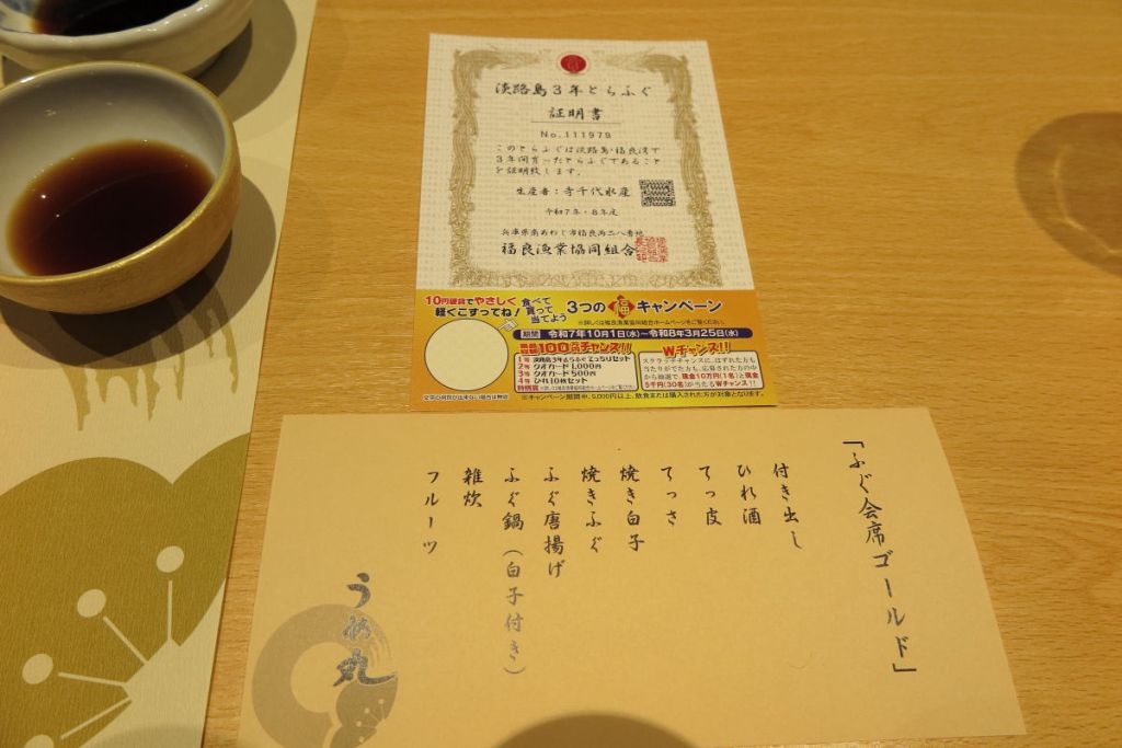 昨年の夕食は鯛活き造りフルコースのプランだったので、今回はふぐ会席ゴールドプランにしました。淡路島の3年とらふぐは一般的に流通している2年物の2倍のサイズで、海水温が一番低く、潮流の早い鳴門海峡で養殖されているので身が引き締まり味も濃厚で、高級なとらふぐと言われています。せっかくなので大きな白子のついたゴールドプランにしました。フリードリンク付きなので酒飲みには助かります。